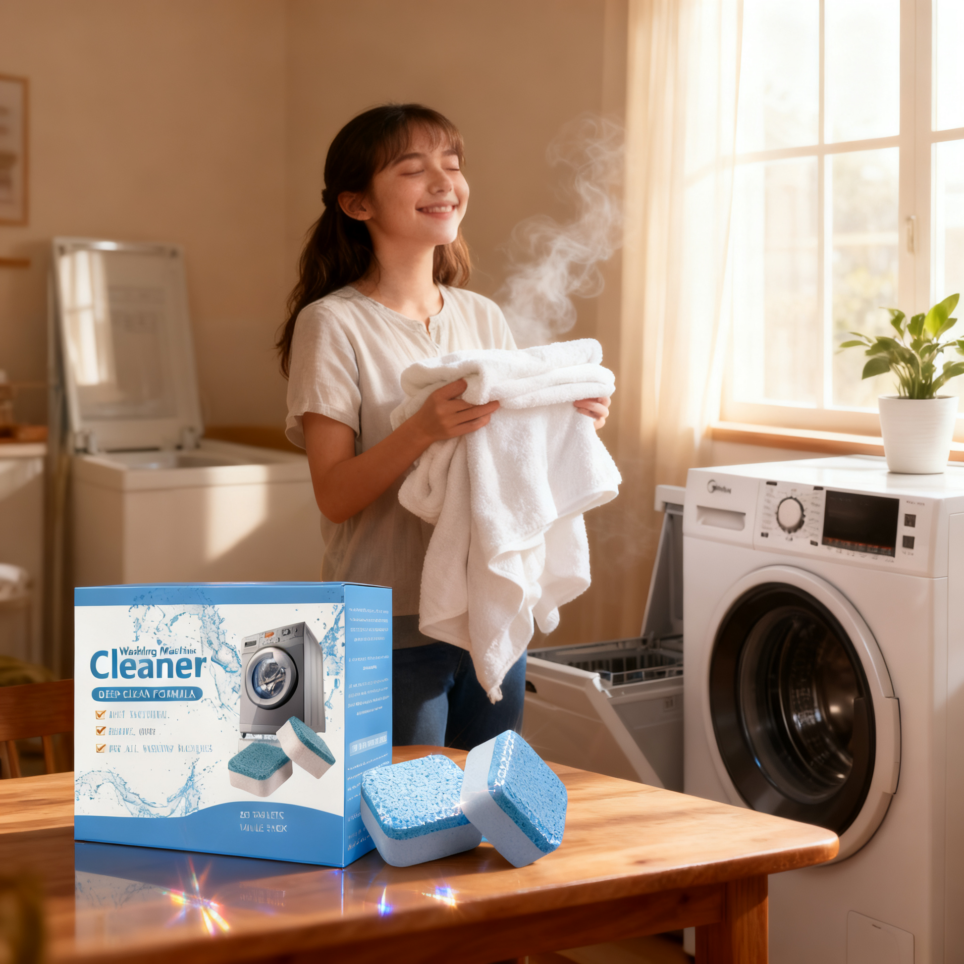 Ahora María usa estas tabletas una vez al mes. Su lavadora funciona perfectamente. Su ropa huele a limpio de verdad. Y nunca más tuvo que llamar al técnico por ese problema.